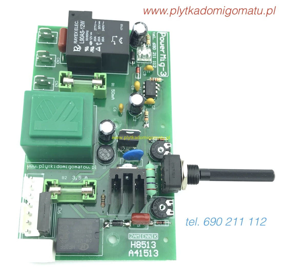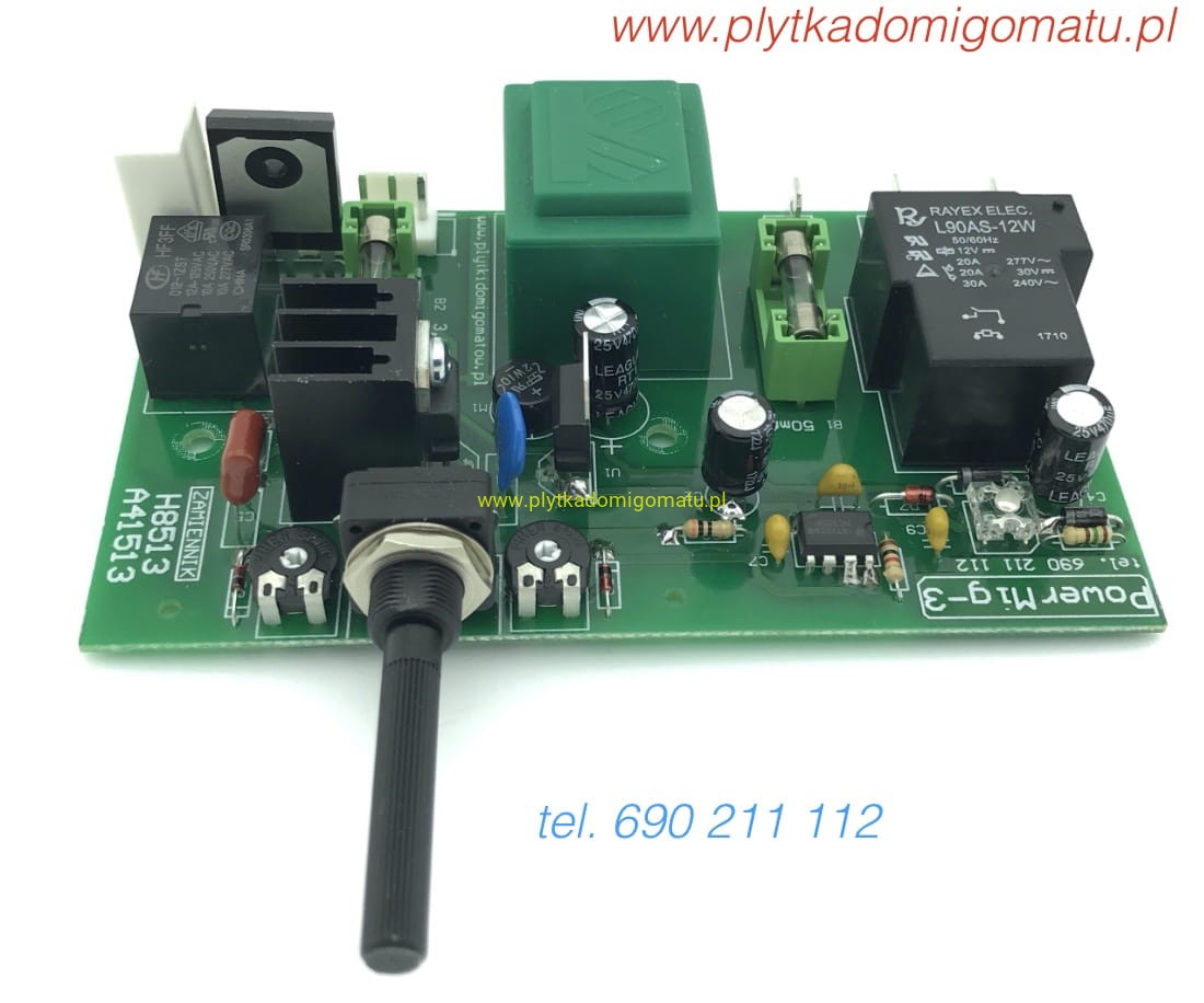 Jeżeli migomat jest tylko na 230V bez możliwości przełączenia, lub tylko na 400V i płytka w wykonaniu 400V - problem nie występuje, jednak takie wykonanie występuje rzadko. W przypadku migomatów tylko na 400V płytka może być w wersji zasilania 400V - wtedy nie ma kondensatora ograniczającego, a napięcie pomiędzy CN2 i CN3 wynosi 400V. Realizując naprawę należy doprowadzić do właściwego zasilania płytki (poprzez wymianę kondensatora na nowy) - po czym - w razie dalszych problemów w działaniu - diagnozować dalej. Zbyt niskie zasilanie powoduje przyśpieszone zużycie styków przekaźnika (JQX-29). Przekaźnik zwiera styki z coraz mniejszą siłą, co powoduje mocniejsze nagrzewanie się styków i ich zużycie. Znane są przypadki wypalenia w płytce otworu średnicy nawet 2 cm w wyniku przegrzania przekaźnika. Po rozwiązaniu problemu z zasilaniem płytki - obserwujemy - czy po wciskaniu przycisku w rękojeści - słychać pracę przekaźników na płytce. Jeżeli nic nie słychać - sprawdzamy obwód przycisku sterującego jak i sam przycisk. Jeśli jest sprawny, płytka ma zasilanie - i nie działa - uszkodzona płytka. Jeśli słychać przekaźniki, a urządzenie nie pracuje - sprawdzamy napięcie w sekcji mocy. W tym celu dołączamy woltomierz do konektorów CN4 i CN3 (bez odłączania ich od płytki). Ze zwolnionym przyciskiem powinniśmy uzyskać wynik 230V lub 400V - zależnie od ustawionego zasilania płytki - a po wciśnięciu przycisku napięcie to ma spaść do zera. Jeśli w stanie spoczynku napięcia nie ma - przerwa w obwodzie zasilania - najczęściej na przełączniku włączającym zasilanie lub na przełączniku zakresów. Jeśli napięcie utrzymuje wartość rzędu np. 1V - warto wykonać próbę podczas spawania (jedna osoba spawa - druga mierzy). Bywa że spadek napięcia na przekaźniku pod obciążeniem wynosi nawet kilkanaście Voltów - co wyraźnie obniża moc urządzenia, a przy dłuższym spawaniu grozi nawet pożarem spowodowanym przegrzaniem płytki i przekaźnika. W przypadku stwierdzenia takich usterek - polecamy wymianę płytki na zastępczą wersję „PRO” w której zamiast mechanicznego przekaźnika zastosowano łącznik półprzewodnikowy. Taki element nie zużywa się, a spadek napięcia na nim - niezależnie od obciążenia - nie przekracza 1V - więc urządzenie będzie uzyskiwało maksymalną moc spawania.